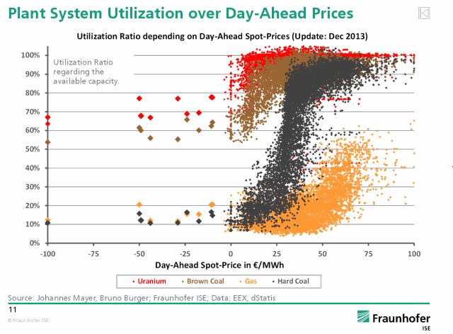Onder de kerncentrales komen kolencentrales, maar er is een groot verschil tussen bruinkool en steenkool. Bruinkool draait meestal op (bijna) volle capaciteit en daalt soms tot ongeveer 60 procent. De capaciteitsfactor van steenkoolcentrales daarentegen daalt met regelmaat, soms zelfs tot slechts 10%. Gascentrales bevinden zich duidelijk in de hoek waar de hardste klappen vallen, zoals ook blijkt uit het aantal aanvragen om gascentrales te sluiten. Het aantal vollasturen van gascentrales is volgens BDEW gedaald van 3400 in 2010 naar 2640 in 2012 (cijfers 2013 nog niet bekend).