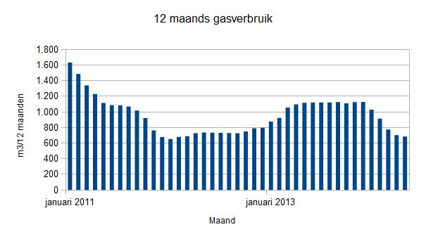 Ons gasverbruik is in mei uitgekomen op 13 m3, dat 58% lager dan vorig jaar. Inmiddels is ons gasverbruik op jaarbasis weer bijna gedaald naar het niveau van begin 2012. Op jaarbasis is ons verbruik nu een kleine 700 m3. Ook ons gasverbruik per graaddag zit met 0,28 nog maar 2 honderdste boven het gasverbruik van begin 2012, als ik al het gasverbruik toereken aan verwarmen en niks aan warm tapwater. Dus tijd om te gaan kijken hoe we de laatste 700 m3 verbruik kunnen aanpakken, bij voorkeur zodanig dat de gasaansluiting weg kan en als dat niet haalbaar is op zo’n manier dat we structureel onder de 500 m3 uitkomen.
