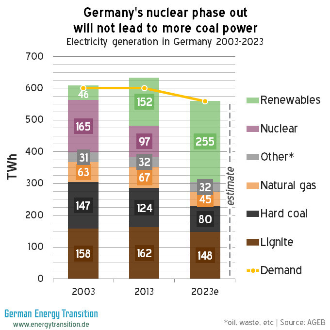 2003 was het jaar waarin de eerste kerncentrale werd gesloten als gevolg van de oorspronkelijke uitfasering van kernenergie uit 2002. 2013 is het laatste jaar waarvoor we volledige gegevens hebben en 2023 is het eerste jaar zonder kernenergie in Duitsland, omdat de laatste kerncentrale in 2022 gesloten wordt.