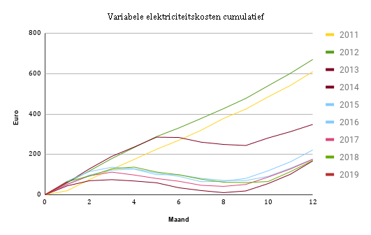 Ons gasverbruik is nagenoeg onveranderd ten opzichte van vorig jaar. In verbruik per graaddag is het wel met 13% gedaald. Januari 2019 was kouder dan januari 2018 en toch ligt ons gasverbruik nauwelijks hoger. Da’s een leuke opsteker. Ons elektriciteitsverbruik is met 14% gedaald. Hoe we dat precies voor elkaar hebben gekregen weet ik niet, mogelijk dat het vervangen van een aantal halogeen lampen door led doorwerkt.