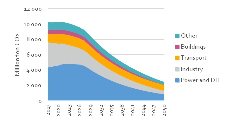 Als gevolg van de wijzigingen in de energiemix en de daling van de totale energievraag daalt ook de CO2 emissie van China sterk. In het scenario dat de wereldwijde opwarming beperkt tot beneden de twee graden Celsius begint de daling al rond 2023.