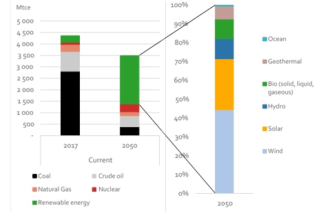 In het scenario zorgt dit voor grote veranderingen in het Chinese energiesysteem. De totale energievraag ligt in 2050 lager dan in 2017, ondanks de verwachte verviervoudiging van de economie.