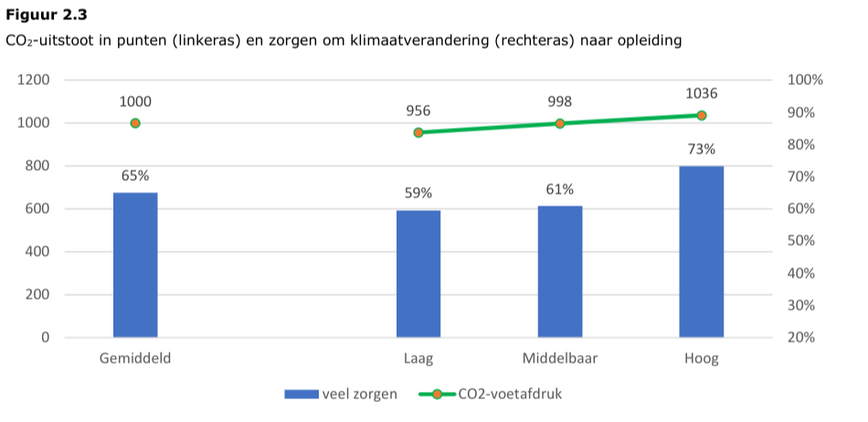 In figuur 2.2 is ook terug te zien dat mensen met een hogere opleiding nou niet echt minder CO2 uitstoten. Dus ook een leercurve lijkt niet aanwezig te zijn. Hooguit is het dat hoger opgeleide mensen zich vaker zorgen maken over klimaatverandering: