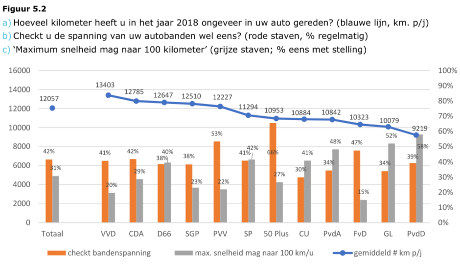 Bij mobiliteit is naar twee belangrijke componenten gekeken. Op de eerste plaats naar autogebruik, waarbij ook gevraagd is of mensen hun bandenspanning regelmatig controleren. Ook is gevraagd of mensen bereid zijn de maximumsnelheid naar 100 km/uur te verlagen. De uitkomsten staan in onderstaande figuur: