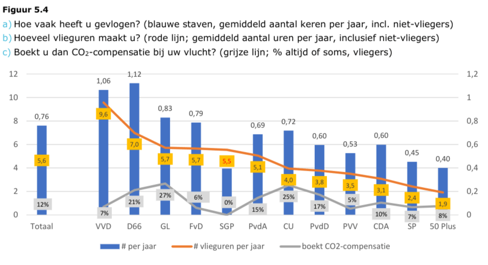 De tweede component voor mobiliteit bestaat uit vliegen. Daarbij is gekeken naar het aantal vlieguren per jaar. Waarbij opvalt dat GroenLinks stemmers inderdaad hoog zitten, iets hoger zelfs dan stemmers op FvD. Enkel stemmers op VVD en D66 vliegen meer. Een andere aardigheid is dat stemmers op SP, 50Plus en PVV minder vliegen dan stemmers op de Partij voor de Dieren.