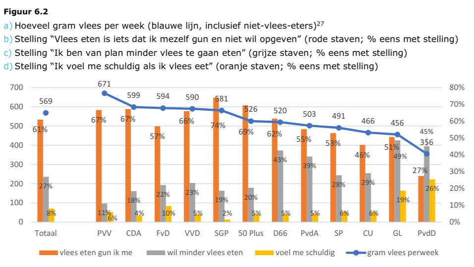 Bij voedsel is enkel gekeken naar de consumptie van vlees. De rangschikking van links naar rechts in onderstaande figuur is op basis van het aantal gram vlees dat per week gegeten wordt. Weinig verrassend scoort de PvdD daarbij het laagst. Opvallender vind ik dat het nog steeds 356 gram per week is. Hier laat zich een grote spagaat tussen denken en doen zien: 45% van de PvdD stemmers is van plan om minder vlees te eten en 26% voelt zich schuldig als hij of zij vlees eet. Dat is ook zichtbaar bij GroenLinks en D66 stemmers, ook daar wil meer dan 40% van de stemmers minder vlees eten.