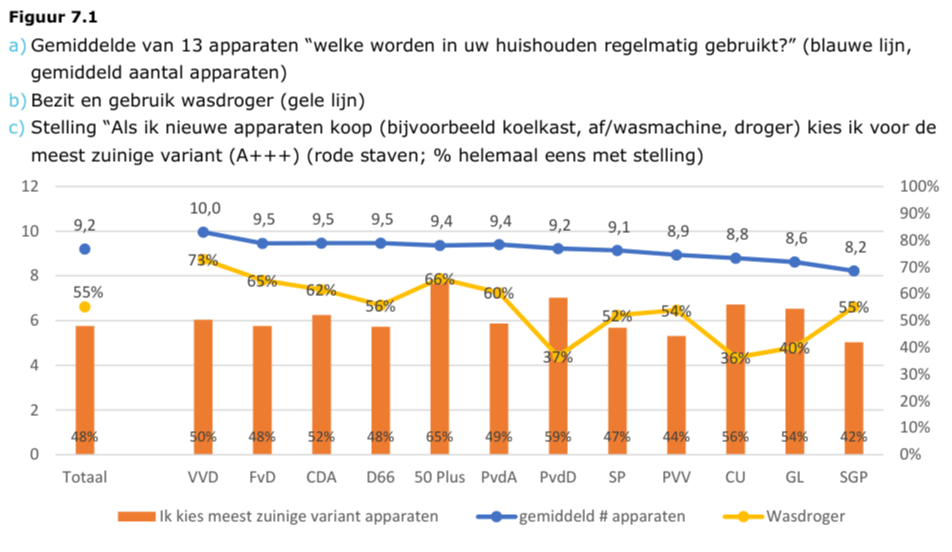 Bij apparaten is het onderscheidt tussen verschillende partijen minder duidelijk zichtbaar. Het percentage mensen dat kiest voor de meest zuinige variant loopt wel uiteen.