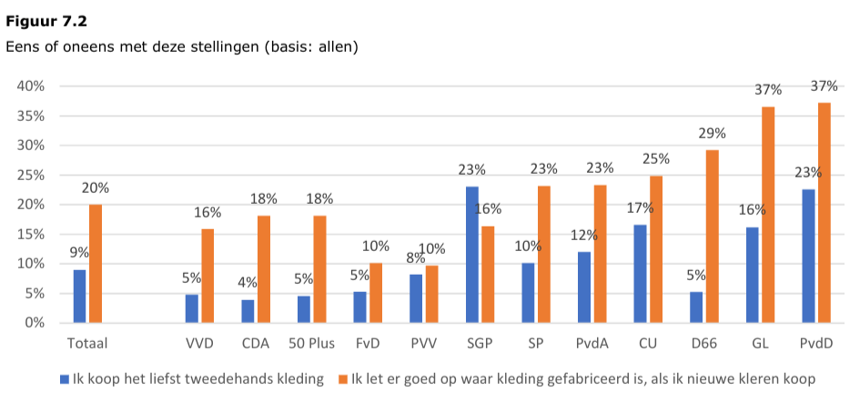 Bij kleding zijn er wel duidelijk verschillen, al is goed zichtbaar dat dit een thema is dat minder lang op de agenda staat. Gemiddeld let slechts 20% van de mensen op waar kleding gefabriceerd. Uitschieters zitten met name bij D66, GroenLinks en PvdD.