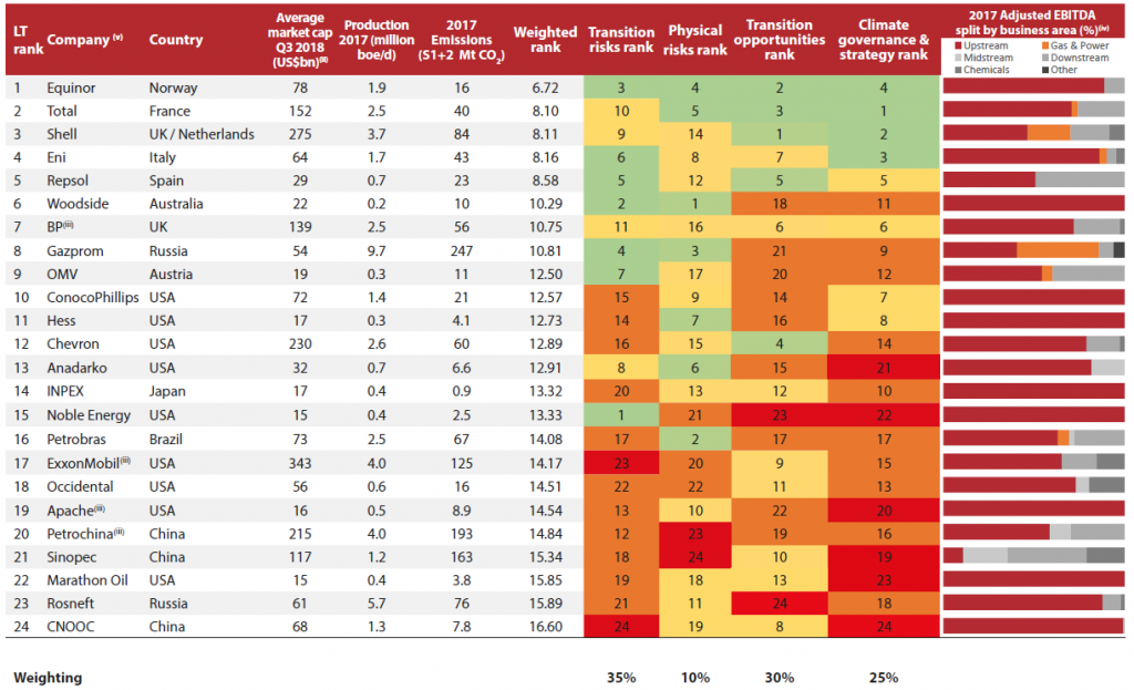 Total, Shell en BP behoren alle drie tot deze top 10. Shell en Total behoren volgens CDP zelfs tot de meest ambitieuze bedrijven, omdat ze naast vermindering van hun eigen CO2-emissies ook doelen stellen voor het verminderen van de CO2 emissies die hun producten veroorzaken. Ook hebben BP, Total en Shell de afgelopen jaren alle drie verschillende bedrijven voor elektrisch laden overgenomen. Total heeft daarnaast bedrijven voor energieopslag, energiemanagement en zonne-energie overgenomen. Total en Shell hebben beide elektriciteitsbedrijven overgekocht, en zijn beide in de race voor de overname van Eneco. Shell heeft recent zelfs aangegeven het grootste elektriciteitsbedrijf ter wereld te willen worden, al zijn investeerders nog niet overtuigd van die strategie.