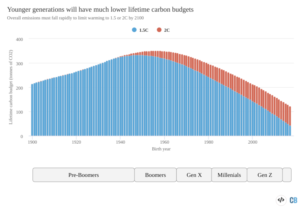 Carbon Brief heeft vorige week een interactieve tool op haar website beschikbaar gemaakt waarmee je op basis van geboortejaar en land kunt nazoeken hoe groot het CO2 budget is dat iemand ter beschikking heeft. Carbon Brief concludeert op basis van haar analyse dat kleinkinderen 8 keer minder CO2 mogen uitstoten dan hun grootouders om de doelstellingen van het Klimaatakkoord van Parijs te halen.