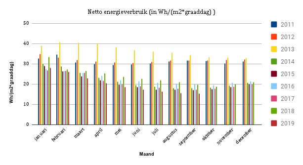 Als ik het energieverbruik per vierkante meter ook nog eens corrigeer voor het aantal graaddagen dan is het netto energieverbruik in 2019 verreweg het laagst.