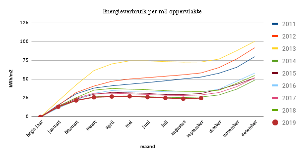 Als ik de energieverbruiken vervolgens omreken naar een standaardjaar van 2802 graaddagen (het gemiddelde in de periode 2000-2018) dan blijkt dat we in 2019 tot en met september iets zuiniger hebben gestookt dan in 2015 en 2017. Het verbruik per vierkante meter ligt in 2019 op 27,0 kWh/m2 en in 2015 en 2017 respectievelijk op 27,3 en 27,1 kWh/m2. Geen groot verschil wel opvallend, omdat er in 2015 en 2017 geen energieverbruik voor verwarming is geweest in de maanden mei en september.