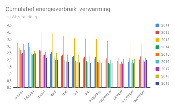 Omgerekend naar een verbruik per graaddag ligt ons cumulatief energieverbruik voor verwarming in september 2019 op 1,76 kWh/graaddag. In september 2015 en september 2017 lag het energieverbruik nog iets lager met respectievelijk 1,72 en 1,73 kWh/graaddag. Alle andere jaren verbruikten we meer energie per graaddag voor de verwarming.