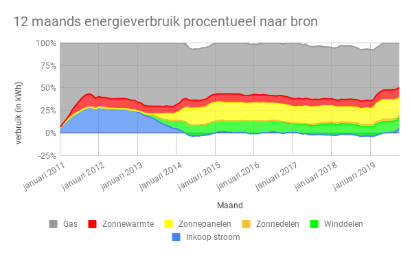 Op jaarbasis kopen we nu 5% van ons energieverbruik in als elektriciteit bij onze energieleverancier. Daarnaast kopen we bijna 50% in aan aardgas. Dat betekent dat we zo’n 45% van ons energieverbruik zelf opwekken. Best een aardige prestatie, al zou ik het aandeel eigen elektriciteit graag verder ophogen.