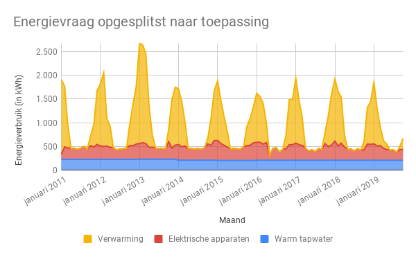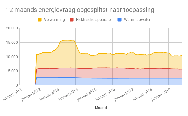 Op jaarbasis is onze energievraag een stuk constanter verdeeld over verwarming, elektrische apparaten en warm tapwater. Ons energieverbruik wil nog steeds niet echt onder de 10.000 kWh op jaarbasis zakken. Al hou ik goede hoop dat dat deze winter nog wel gaat lukken.