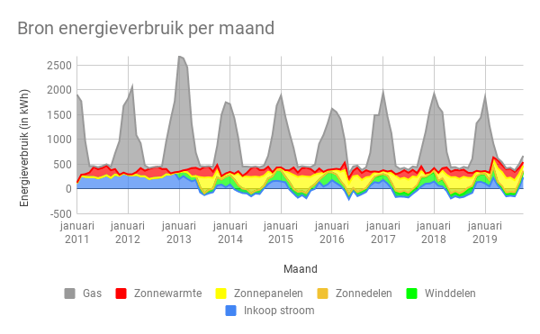 Wanneer we het energieverbruik meer uitsplitsen naar bron op maandbasis, dan is duidelijk zichtbaar dat we in de zomermaanden meer elektriciteit opwekken dan we nodig hebben, terwijl we in de winter tot nu toe een piek in ons aardgasverbruik hebben. Dit jaar blijft de aardgaspiek vooralsnog uit, omdat we ons huis verwarmen met infraroodpanelen. Het energieverbruik is in oktober wel opgelopen ten opzichte van september. Wat ook te verwachten is nu het stookseizoen begonnen is.