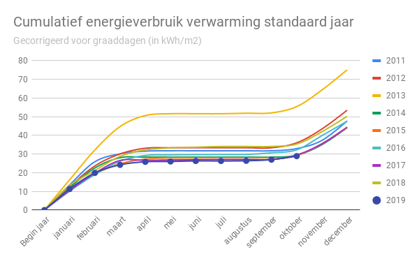 Nu het stookseizoen in oktober echt weer is begonnen is het ook tijd om het energieverbruik per graaddag te vergelijken. In oktober 2019 hebben we meer energie per graaddag verbruikt dan in 2018. Ons energieverbruik voor verwarming lag wel 16% lager dan onze gemiddelde energieverbruik per graaddag in de periode 2011-2018.