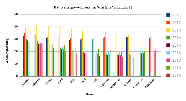 Wanneer ik kijk naar het netto energieverbruik gecorrigeerd voor vloeroppervlak en voor graaddagen dan ligt dit 16% lager dan het gemiddelde in de periode 2014-2018. De periode 2011-2013 tel ik niet mee, omdat dat de periode voor onze zonnepanelen was. Daardoor is het netto energieverbruik over die periode niet goed vergelijkbaar met het netto energieverbruik in de periode 2014-2018.