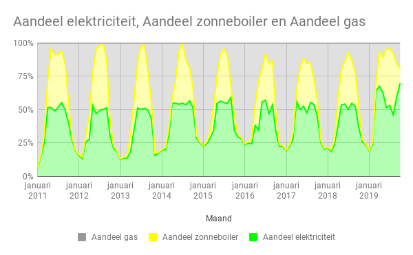 Hieronder een nieuw grafiekje, waarin de procentuele verdeling van de energielevering tussen elektriciteit, zonneboiler en aardgas is weergegeven. Deze grafiek laat duidelijk zien dat het grootste deel van ons gasverbruik in de winter zit. De grafiek laat zien dat het lastig is en blijft om in de zomermaanden helemaal aardgasvrij te zijn, ondanks de zonneboiler. De grafiek laat ook het effect zien van onze infraroodpanelen. Het percentage aardgas daalt vanaf maart 2019 beduidend sneller dan eerdere jaren.