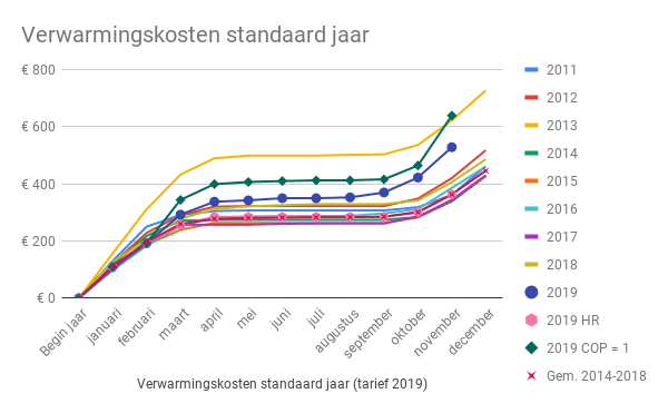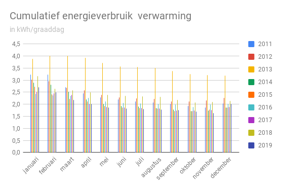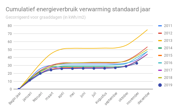In bovenstaande grafiek is te zien dat ons energieverbruik per graaddag in november lager lag dan in voorgaande jaren. Niet een klein beetje, maar 40% lager dan in 2018. Ook ten opzichte van ons gemiddelde energieverbruik per graaddag in november in de periode 2011-2018 ligt het verbruik 40% lager. Zelfs als ik 2013, het jaar waarin we bovengemiddeld veel gestookt hebben, niet meereken.