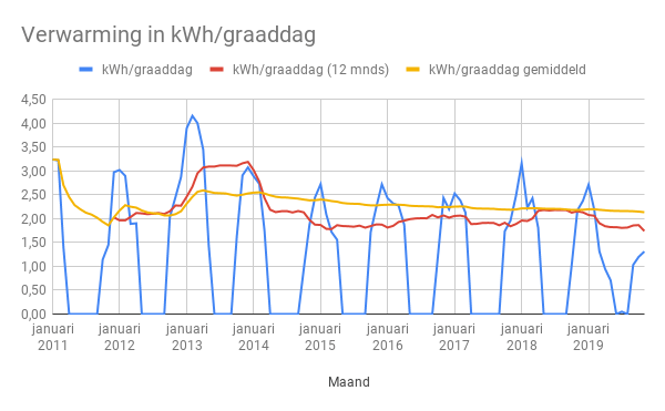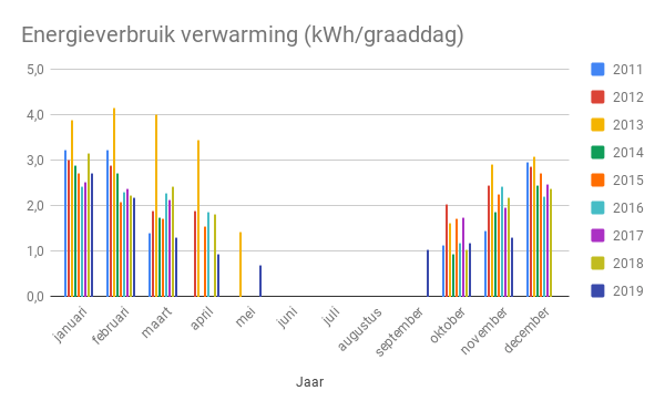 Ook in bovenstaande grafiek is te zien dat het aantal kilowattuur dat we verbruiken voor verwarming per graaddag daalt. De meest heldere maand om dat te gaan zien wordt januari, lager dan 2,5 kWh/graaddag hebben we nog nooit gehaald.