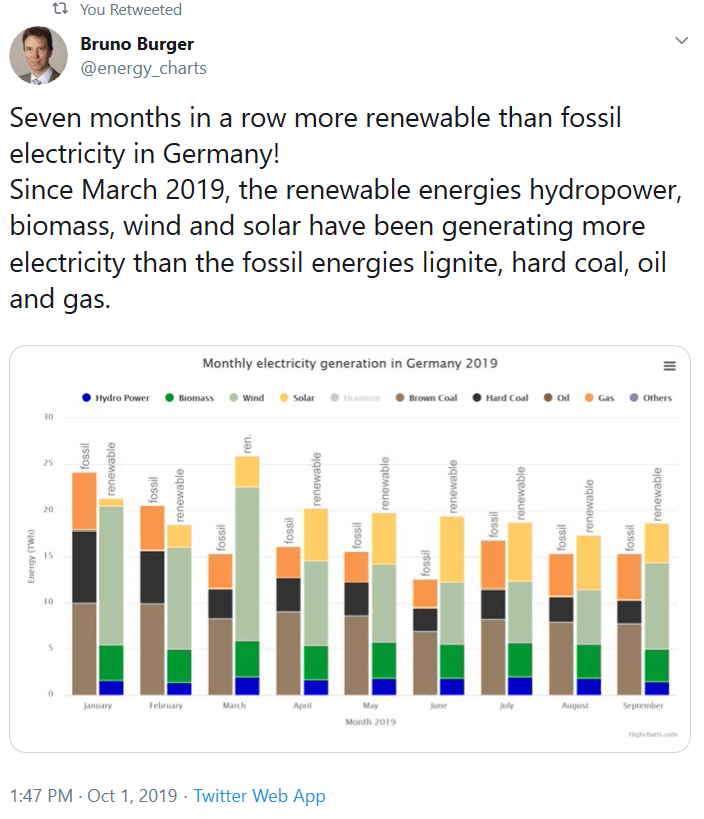 In 2011 waren 8 van Duitsland’s 17 kerncentrales gesloten. In de periode 2010-2017 daalde de emissies van de Duitse elektriciteitssector met meer dan 15%. Er zijn nog geen cijfers voor de elektriciteitssector in 2018, maar de emissies van de Duitse energiesector daalde met bijna twee procent. Tot op heden heeft hernieuwbare energie in 2019 een aandeel van bijna 50% in de elektriciteitsproductie. Duitsland produceert nu ongeveer 210 TWh hernieuwbare energie (exclusief waterkracht), veel meer dan het record van 171 TWh voor kernenergie uit 2001. Sinds 2010 is de productie van groene stroom bijna dubbel zo hoog als de afname van kernenergie. Ongeveer 90% hiervan is wind- en zonne-energie. Duitsland laat duidelijk zien dat hernieuwbare energiebronnen de CO2 emissies kunnen verlagen tijdens een .