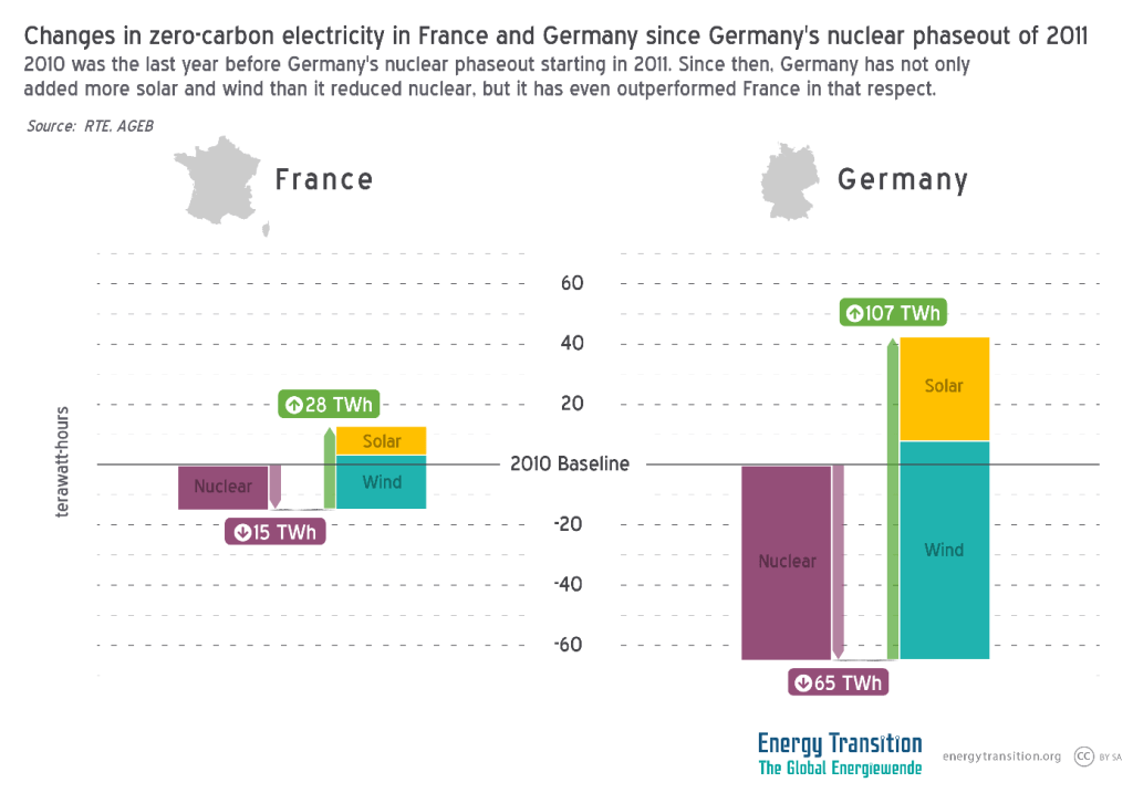 De huidige Franse situatie suggereert dat, als je toegewijd blijft aan kernenergie, de productie van kernenergie toch krimpt; en dat tot overmaat van ramp de groei van hernieuwbare energiebronnen moeite heeft om het ontstane gat te vullen. Duitsland suggereert dat, als je het bij hernieuwbare energiebronnen houdt en kernenergie geleidelijk afbouwt, de groei van hernieuwbare energiebronnen bijna dubbel zo groot is als de daling in atoomstroom en dat je de uitstoot in de energiesector jaarlijks met 2 procentpunten vermindert.