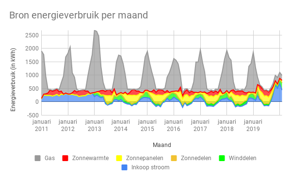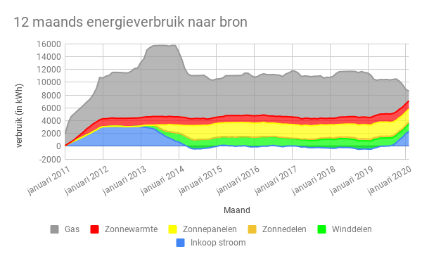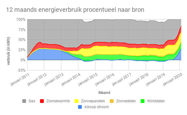 De daling van ons aardgasverbruik is goed te zien als ik energieverbruik uitsplits tussen aardgas, elektriciteit en zonnewarmte. Het aandeel aardgas is sinds maart 2019 fors gedaald en bedraagt inmiddels minder dan 20% van ons totale energieverbruik.