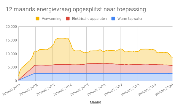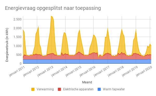 Ons energieverbruik valt grofweg in drie delen uiteen: verwarming, warm water en elektrische apparatuur. Een deel van de elektrische apparatuur is gebouwgebonden, bijvoorbeeld de mechanische ventilatie. Deze reken ik voor het gemak gewoon mee met de elektrische apparaten. Alleen het elektriciteitsverbruik van de infraroodverwarming reken ik los.