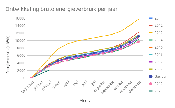 Ons bruto energieverbruik ligt in januari plus februari op ongeveer 2.000 kWh. Dat is bijna 40% lager dan het gemiddelde over de periode 2011-2018, exclusief 2013.