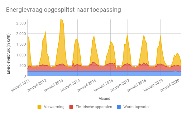 In het totale verbruik op jaarbasis is vooral het verbruik voor verwarming gedaald. Dit is nog maar 35% van ons totale energieverbruik. Terwijl dit in voorgaande jaren tussen de 40 en 50% schommelde.