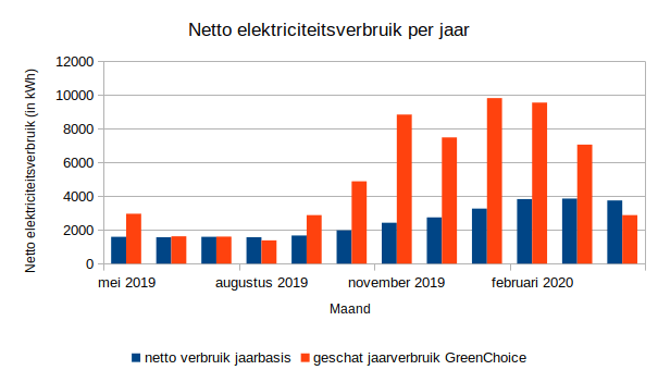 Zoals iedere maand heeft Greenchoice ons een overzicht gestuurd van ons gas- en elektriciteitsverbruik in april. Dit overzicht bevat ook een inschatting van ons netto-elektriciteitsgebruik op jaarbasis. Ons werkelijk elektriciteitsverbruik op jaarbasis ligt al 3 maanden gelijk net onder de 4.000 kWh. De verwachting van Greenchoice is gedaald van bijna 10.000 kWh in januari en februari, naar 7.000 kWh in maart. In april is de inschatting gedaald naar minder dan 3.000 kWh per jaar, terwijl ons werkelijk elektrictieitsverbruik nog steeds rond de 4.000 kWh ligt.
