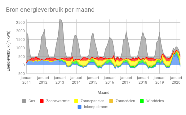 Ook ons netto energieverbruik ligt dit jaar beduidend lager dan in voorgaande jaren, terwijl we geen extra zonnepanelen, zonneboiler, zonnedelen of winddelen hebben aangeschaft. Wat naast het lagere bruto energieverbruik wel meehelpt is dat onze zonnepanelen, zonnedelen en winddelen de eerste vier maanden zo’n 100 kWh meer hebben opgewekt dan in 2019.