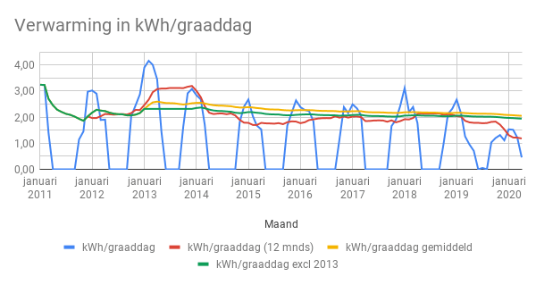 Het totale energieverbruik voor verwarming gecorrigeerd voor de temperatuur lag ook lager dan voorgaande jaren. Op jaarbasis verbruiken we nu in een standaardjaar (2.790 graaddagen) 3.300 kWh. Dat is 41% minder dan waar het model van CE vanuit gaat.