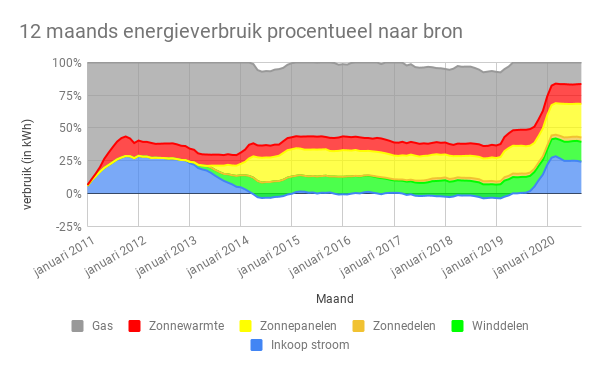 Ook het aandeel van de verschillende bronnen begint zich na een jaar te stabiliseren. Inkoop van elektriciteit vormt nu zo’n 25% van onze energiemix en ons aardgasverbruik is gedaald naar zo’n 17% van onze energiemix. De zonnepanelen vormen 25% en de zonneboiler 15%. Ook onze winddelen vormen zo’n 15% van onze energiemix. De overige paar procent komt uit onze zonnedelen.