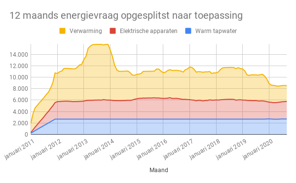 Op jaarbasis ligt ons energieverbruik op iets meer dan 8.500 kWh. Daarvan gaat 3.000 kWh op aan elektrische apparaten, 2.700 kWh aan warm water en bijna 2.800 aan verwarming. Als ik de verwarming corrigeer voor temperatuur komt ons verbruik uit op 3.128 kWh per jaar. Van de daling in ons energieverbruik met 1.700 kWh per jaar wordt dus zo’n 3.000 kWh veroorzaakt door het warmere weer.