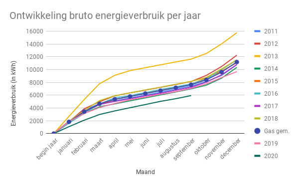 September is afgelopen, oktober begonnen. Tijd dus voor de maandelijks update van ons energieverbruik. Het belangrijkste dat opvalt is dat september 2020 in graaddagen gemeten slechts 10 graaddagen minder heeft dan in 2019, terwijl onze ruimteverwarming wel fors lager lag. Ook het gasverbruik voor warm water lag lager dan in 2019, blijkbaar was september 2020 een zonnige maand vergeleken met september 2019. Het elektriciteitsverbruik van apparaten lag 14% hoger dan vorig jaar. De totale hoeveelheid opgewekte energie 13% hoger en we verbruikten 37% van het verbruik van onze zonnepanelen zelf, de rest leverden we terug.