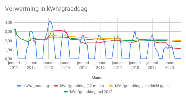 Ons verbruik per graaddag lag in september op 0,02 kWh per graadddag, veroorzaakt door het openlaten van de buitendeur op een koude dag waardoor de hal verwarming aan is gesprongen. Op jaarbasis ligt ons verbruik op 1,12 kWh/graaddag dat is bijna de helft lager dan de 2,03 kWh/graaddag die we sinds we in 2011 in ons huis zijn gaan wonen hebben verbruikt. Op jaarbasis is het laagste wat we met cv-ketel hebben gehaald 1,7 kWh/graaddag. Ook daar zitten we dus ruim onder.