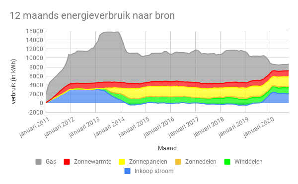 Op jaarbasis is vormt eigen opwek het grootste deel van onze energiemix. Van de ruim 8.600 kWh wekken we ruim 5.100 kWh zelf op met onze zonneboiler, zonnepanelen, zonnedelen en winddelen. De overige 3.500 kopen we in bij onze energieleverancier, waarvan een kleine 2.100 kWh in de vorm van elektriciteit. De overige 1.400 kWh is aardgas, omgerekend een kleine 150 m3.