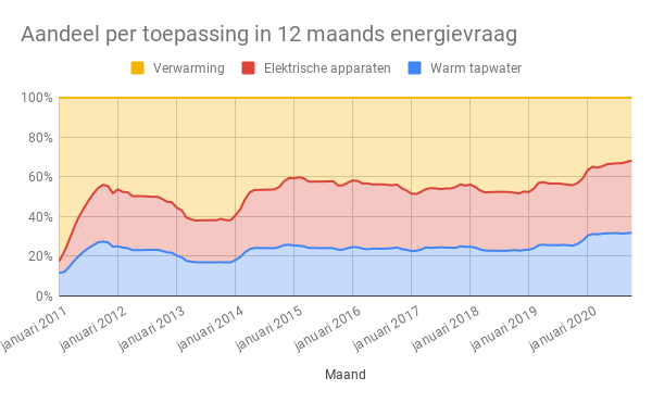 Een stukje over het energieverbruik per toepassing heb ik al verklapt. In onderstaande grafiek is het maandelijks energieverbruik per toepassing te zien. De stookseizoenen zijn daarbij goed zichtbaar. De behoefte aan warm water is heerlijk constant, hoewel dat vanaf de overstap op infraroodverwarming ook wat begint te schommelen. De berekening in de jaren daarvoor waren gebaseerd op gegevens van MilieuCentraal over het aandeel van warm water in het totale gasverbruik. Na de overschakeling op infraroodverwarming is warm water de enige toepassing waarvoor we nog aardgas gebruiken. Het wordt interessant om te zien of we ook deze winter fors lager blijven in ons maandelijks energieverbruik voor verwarming als vorig jaar. Ik verwacht namelijk niet dat ik nog dit stookseizoen volle werkweken terug kan naar kantoor.