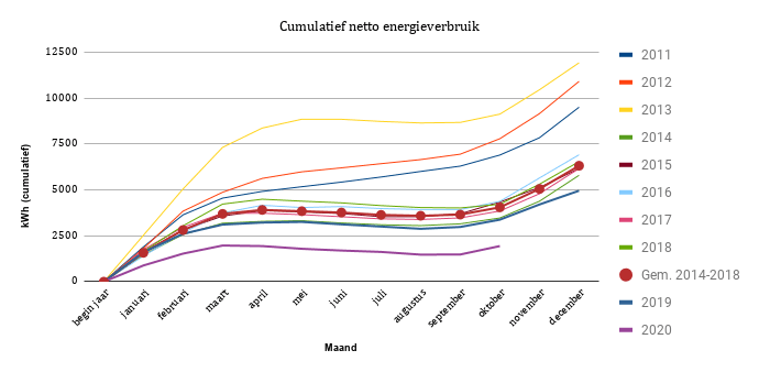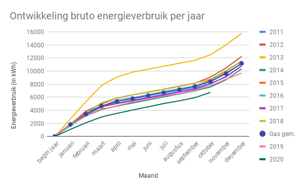 Door naar het saaie deel, ons bruto energieverbruik. Hoewel saai? Ook dat ligt dit jaar beduidend lager dan het gemiddelde in de periode 2011-2018, exclusief 2013. Ons bruto energieverbruik ligt 20% lager dan het gemiddelde over de periode 2011-2018, exclusief 2013. Aan ons huis is dit jaar niks veranderd, behalve dan dat we sinds maart dit jaar veel meer thuis zijn door de coronamaatregelen en ik dus een hoger energieverbruik zou verwachten.
