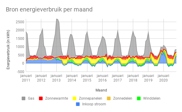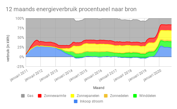 Ook de mix waar we onze energie vandaan halen is behoorlijk verandert sinds begin 2019. De inkoop van elektriciteit is weer terug in de mix met een aandeel van ruim 20%. Toch is de mix behoorlijk verandert sinds we in 2011 in ons huis zijn gaan wonen. Kochten we in 2012 nog bijna 80% van onze energie in in de vorm van elektriciteit en aardgas, inmiddels wekken we ruim 60% van onze energie zelf op.
