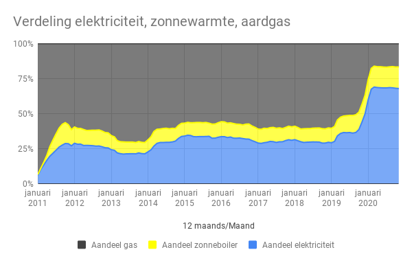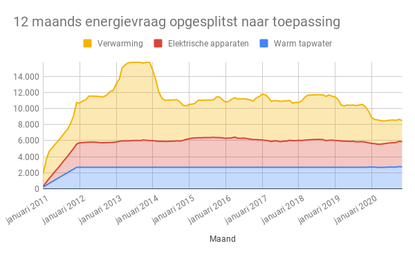 Als ik kijk naar het aandeel van de verschillende toepassingen in ons energieverbruik, dan daalt het aandeel voor verwarming nog steeds. Het aandeel van warm water blijft de laatste paar maanden redelijk gelijk, voor het verbruik voor elektrische apparaten stijgt. Wat op zich niet raar is, aangezien er met thuiswerken beduidend vaker laptops en lichten aan zijn, ook hebben we extra wifi-toegangspunten geïnstalleerd voor thuiswerken.