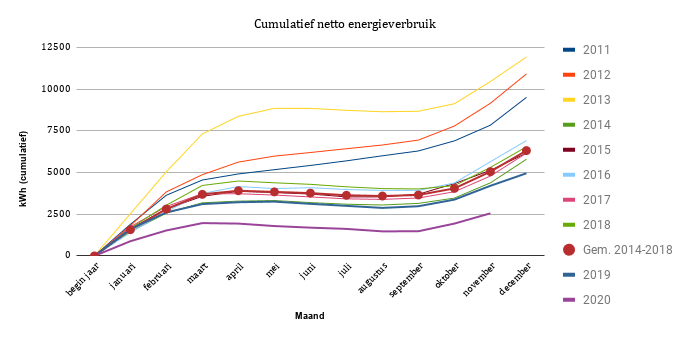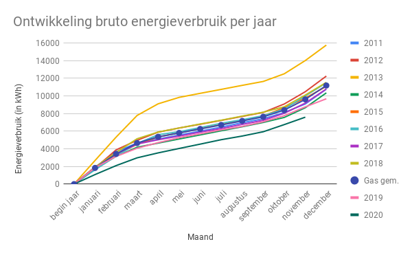 Ons bruto energieverbruik, dus het energieverbruik zonder wat we opwekken ligt tot en met november 20% lager dan gemiddeld in voorgaande jaren. Ik heb geen reden om te verwachten dat dit in december nog erg gaat veranderen. De daling die sinds maart 2019 zichtbaar is zet dus door. Deels doordat 2020 wederom een warm jaar is, deels door de verandering van wijze van verwarming van ons huis. Als ik corrigeer voor het warmere weer blijft een daling van 19% van ons bruto energieverbruik over.
