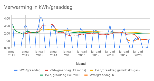 Op jaarbasis verbruiken we in een standaardjaar (met het gemiddeld aantal graaddagen van de afgelopen 10 jaar) 3.070 kWh. Dat is 46% lager dan ons langjarig gemiddelde verbruik met de HR-ketel. Als geen rekening gehouden wordt met het aantal graaddagen lag ons jaarverbruik over de afgelopen 12 maanden op 2.622 kWh. Dat betekent dat we dus ruim 400 kWh aan energie bespaart hebben doordat de afgelopen 12 maanden warmer zijn dan gemiddeld in de periode 2000-2019.