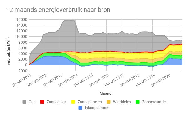 Ons bruto energieverbruik is uitgekomen op 8.819 kWh, dat is 22% lager dan de mediaan over de periode 2011-2018. De jaren waarin we ons huis met aardgas verwarmden. Al met al geen slecht resultaat na 9 maanden thuiswerken, wat toch echt een hele grote verandering in levensstijl en gebruik van ons huis heeft betekend.