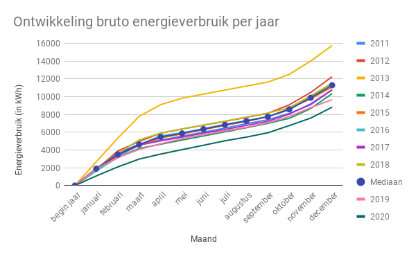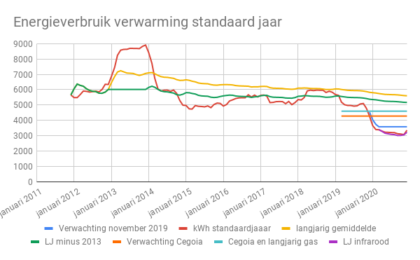 Omgerekend naar een standaardjaar, waarbij een standaardjaar hier het gemiddeld aantal gewogen graaddagen voor de periode 2000-2019 is, hebben we in 2020 ruim 3200 kWh verbruikt. In werkelijkheid lag het aantal gewogen graaddagen lager dan het gemiddeld aantal graaddagen in de genoemde periode, waardoor we in werkelijkheid een kleine 2.900 kWh hebben verbruikt. Bijna 300 kWh minder, doordat er 405 gewogen graaddagen minder waren in 2020 dan gemiddeld in de periode 2000-2019. De berekening van het aantal gewogen graaddagen zonder klimaatverandering vergt wat meer tijd, wordt aan gewerkt.