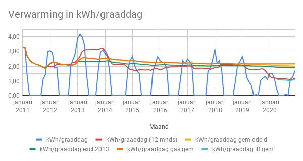 Tot slot de cijfers voor verwarming, omgerekend naar het gebruik per gewogen graaddag. Daarbij is geen rekening gehouden met het effect van minder graaddagen door klimaatverandering, waar ik eerder over schreef.