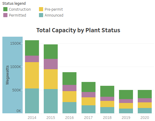 Het totaal vermogen aan kolencentrales dat is aangekondigd, waar vergunning voor is aangevraagd of verleend en dat in aanbouw is sinds 2014 fors gedaald. De druk op investeerders (banken, pensioenfondsen, vermogensbeheerders) en verzekeraars om zich terug te trekken uit de financiering van kolencentrales groeit ook nog steeds.