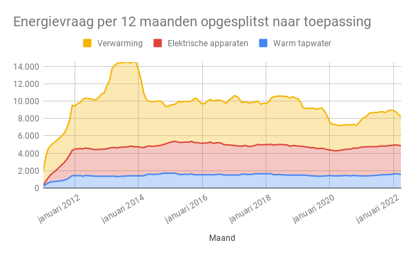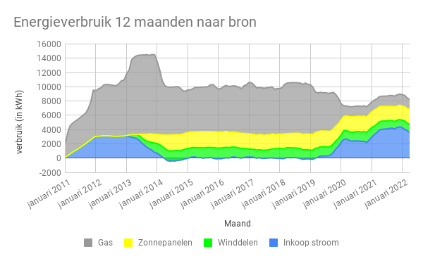 Op jaarbasis is onze energievraag momenteel een kleine 8.200 kWh. Ik verwacht dat daar nog een kleine 1.000 kWh vanaf gaat als we weer vaker naar kantoor mogen en door onze warmtepomp voor warm water. Daarmee zou ons energiegebruik terug zijn op het niveau van begin 2020, maar dan zonder aardgas.